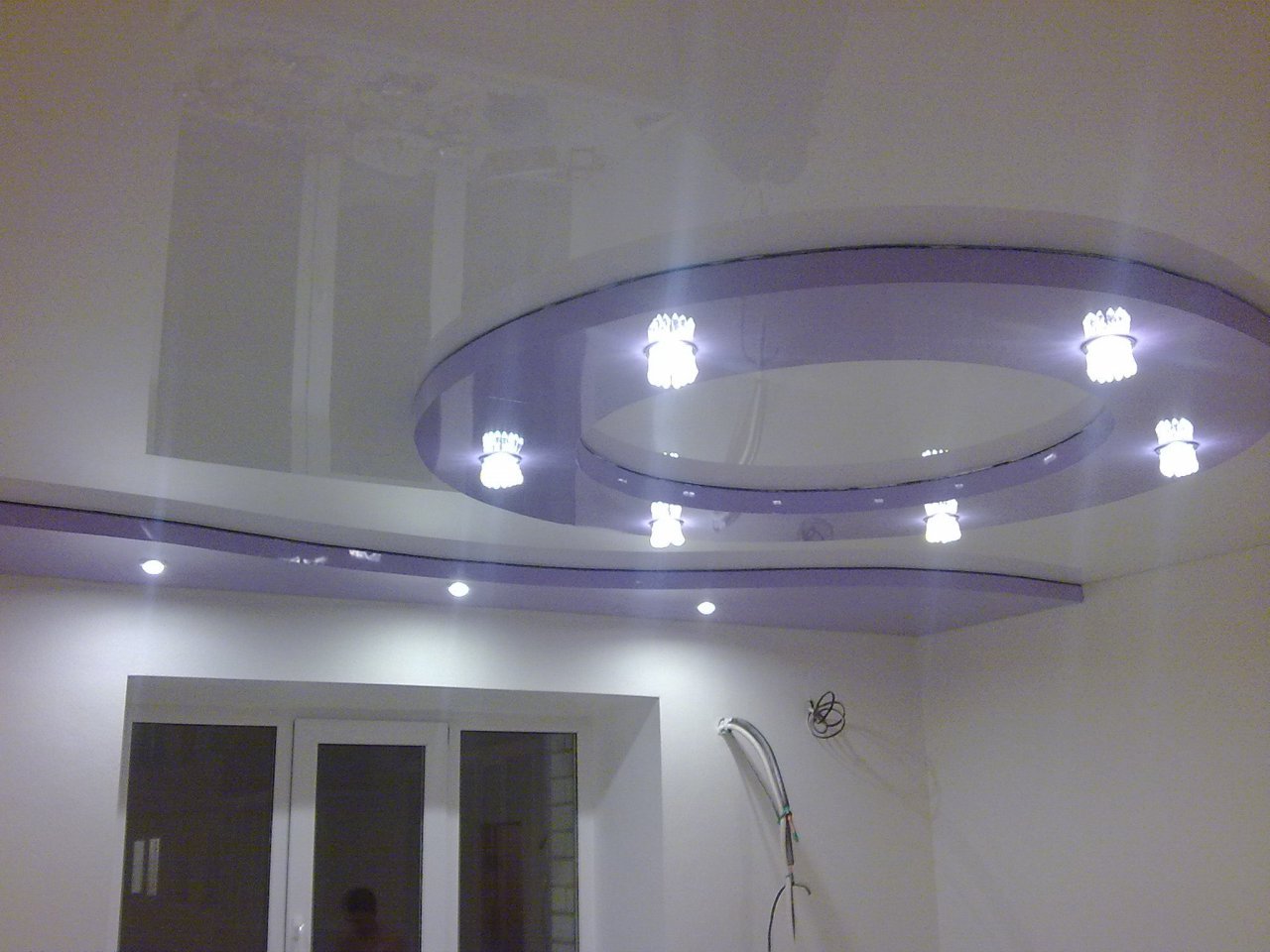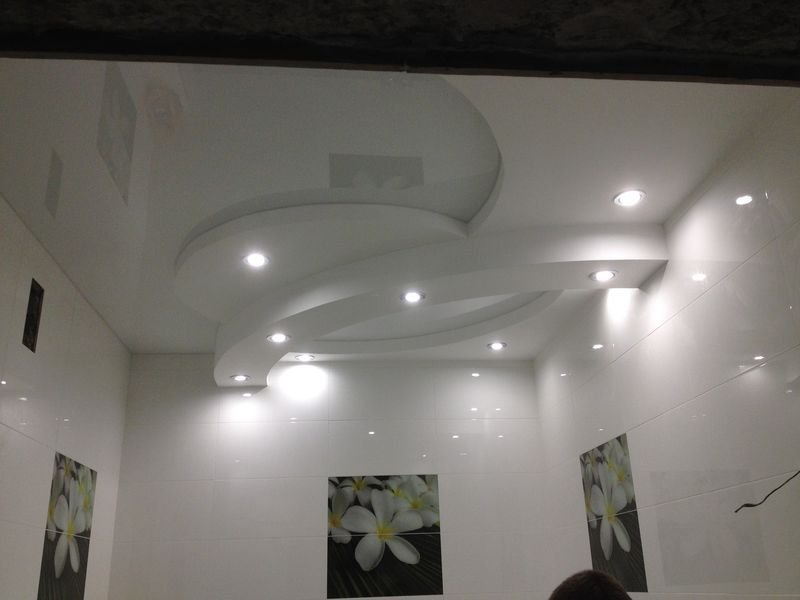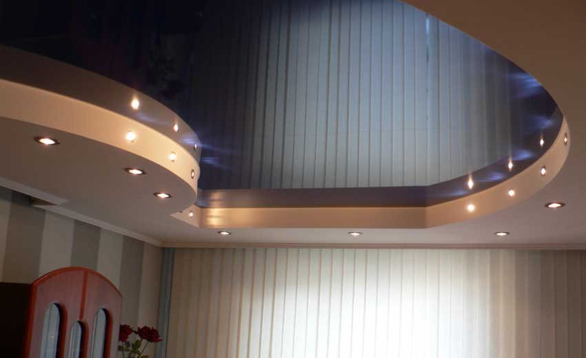 Среди возможных вариантов отделки глянцевую фактуру может иметь только плёнка ПВХ. Какую бы Вы краску не использовали, такого зеркального эффекта она не даст. Если раньше в подавляющем большинстве старались установить в многоуровневых конструкциях яркие и контрастные цвета, то в последнее время очень часто используют в разных уровнях белый цвет, просто разных фактур, чаще всего матовую и глянцевую.