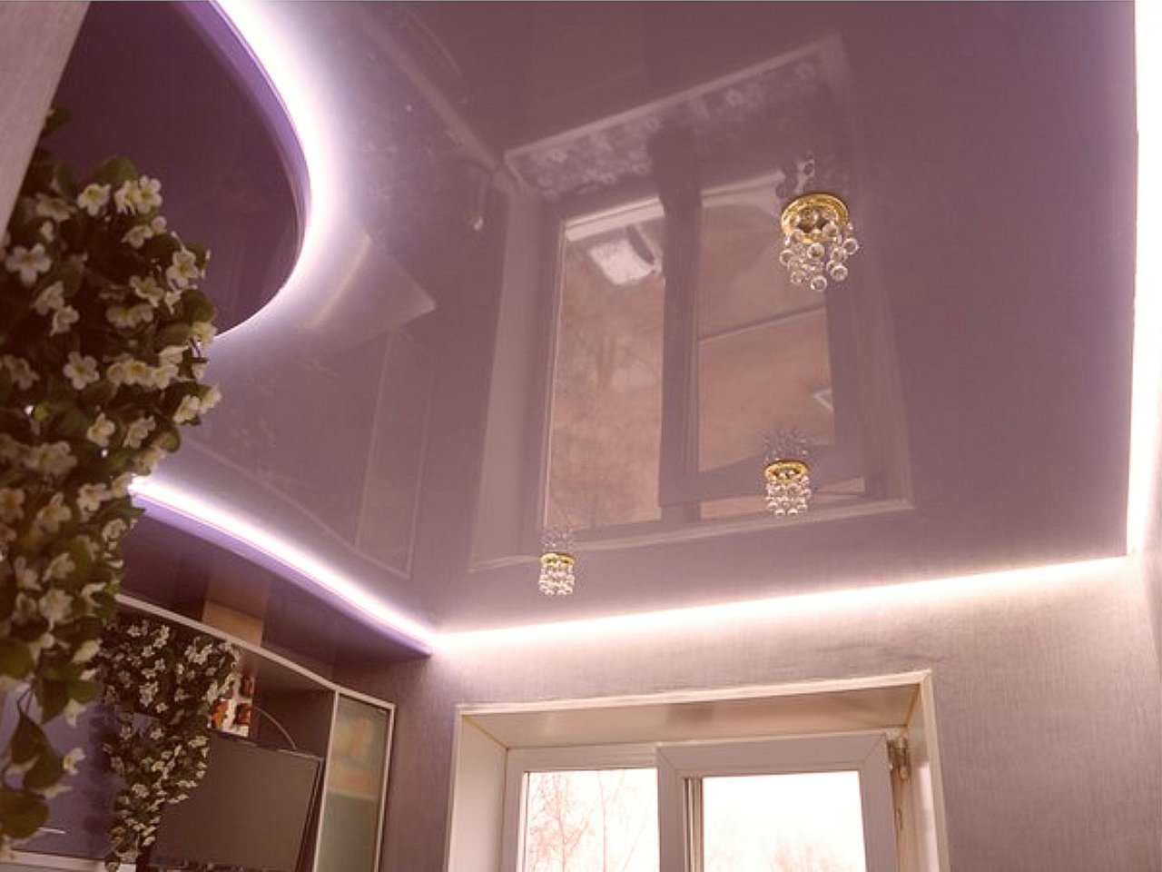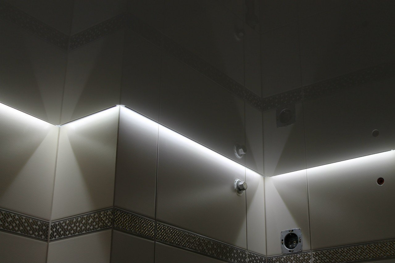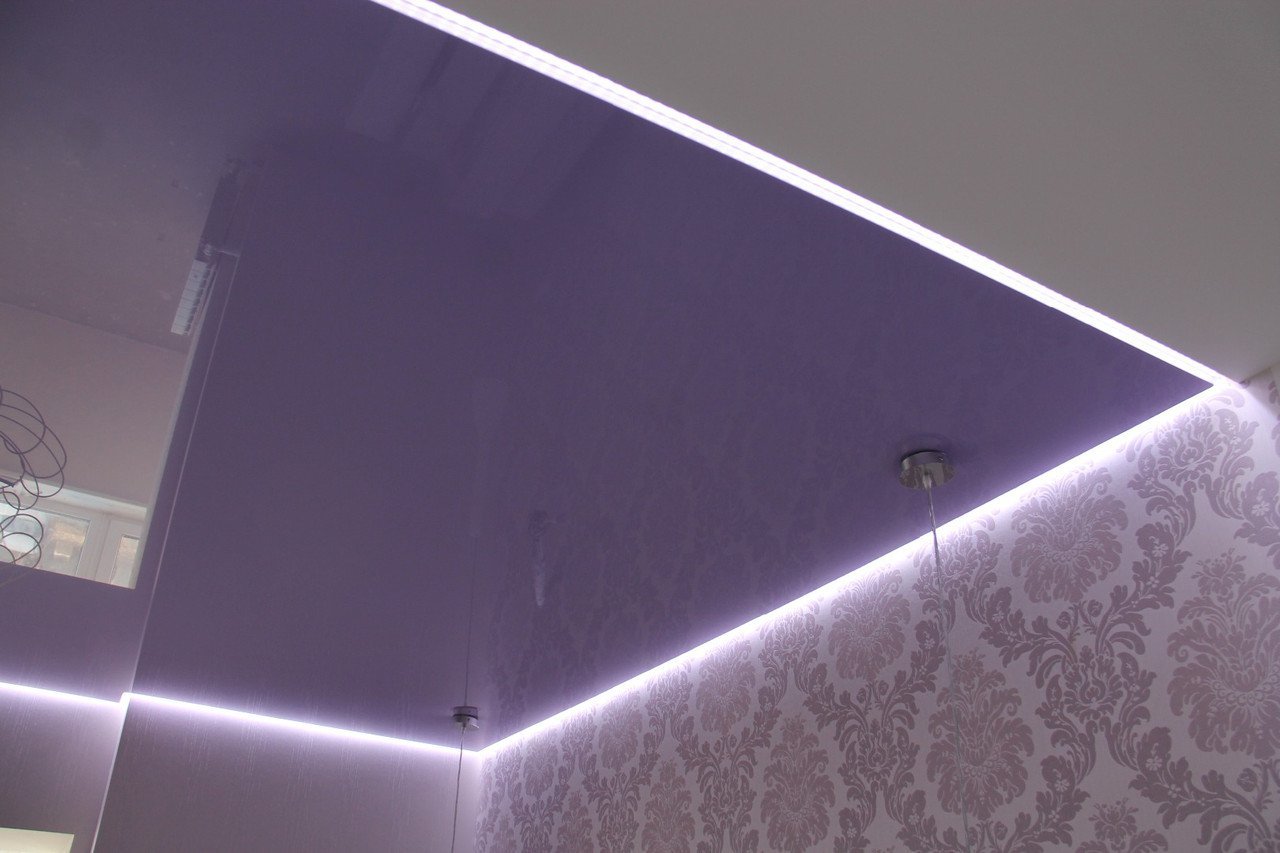 В отличие от потолков с подсветкой, расположенной в нишах, или от прозрачных потолков, в которых подсветка устанавливается над полотном, в парящих потолках подсветка от светодиодной ленты идет строго по периметру потолка (или фигурной конструкции, если она является частью многоуровневого потолка). Это значит, что все "погрешности" бетонного основания, провода, коммуникации будут надежно скрыты под полотном, и никакие изъяны подсвечиваться не будут.